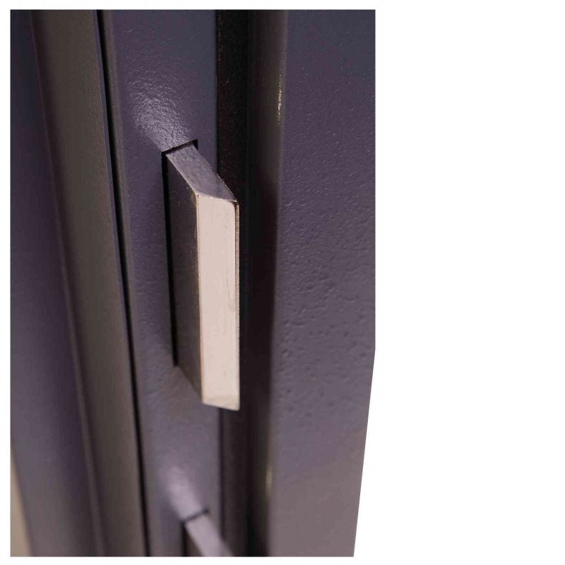 - Сейф HS2053E оборудуется четырёхсторонним ригельным механизмом, представленным шестью прямоугольными стальными ригелями 100×10 мм – выдвигающимися с трёх сторон, а также пассивными (неподвижными) со стороны петель.